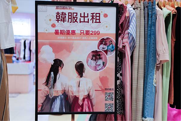 門囗有一個告示牌寫著「韓服體驗」這就走進去。